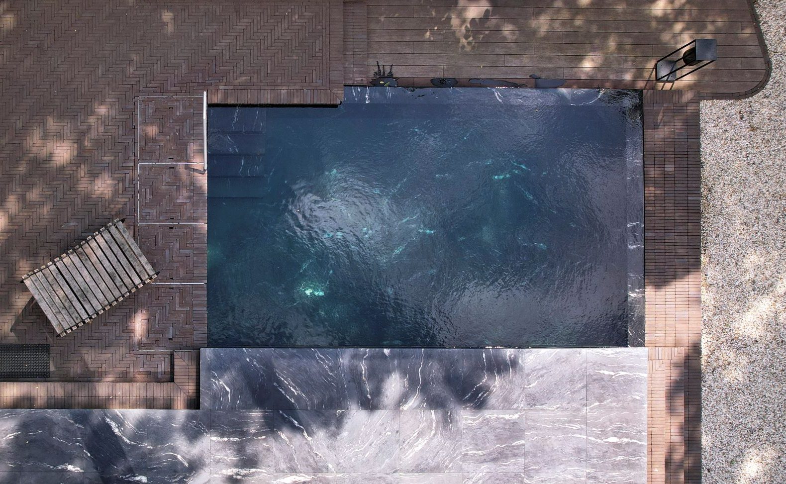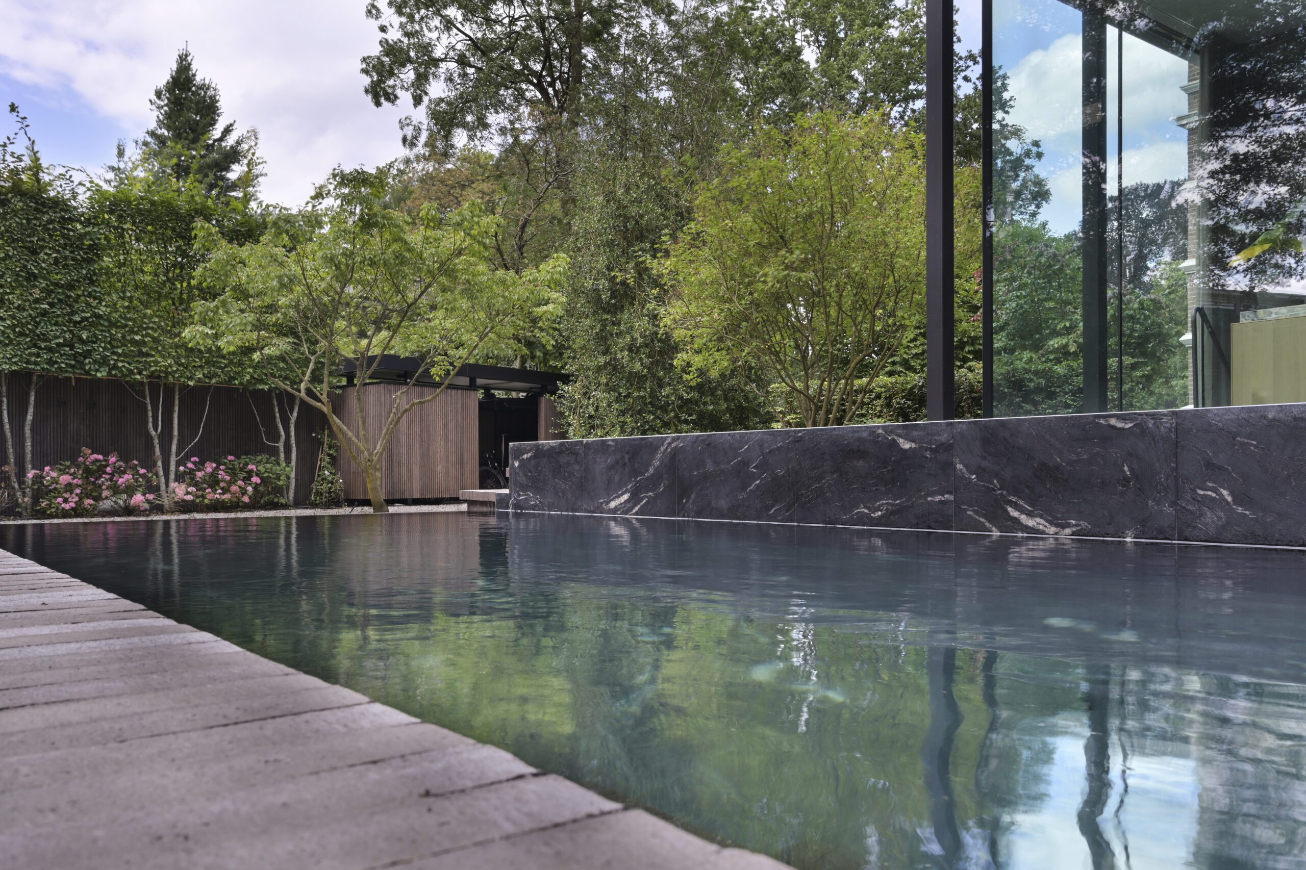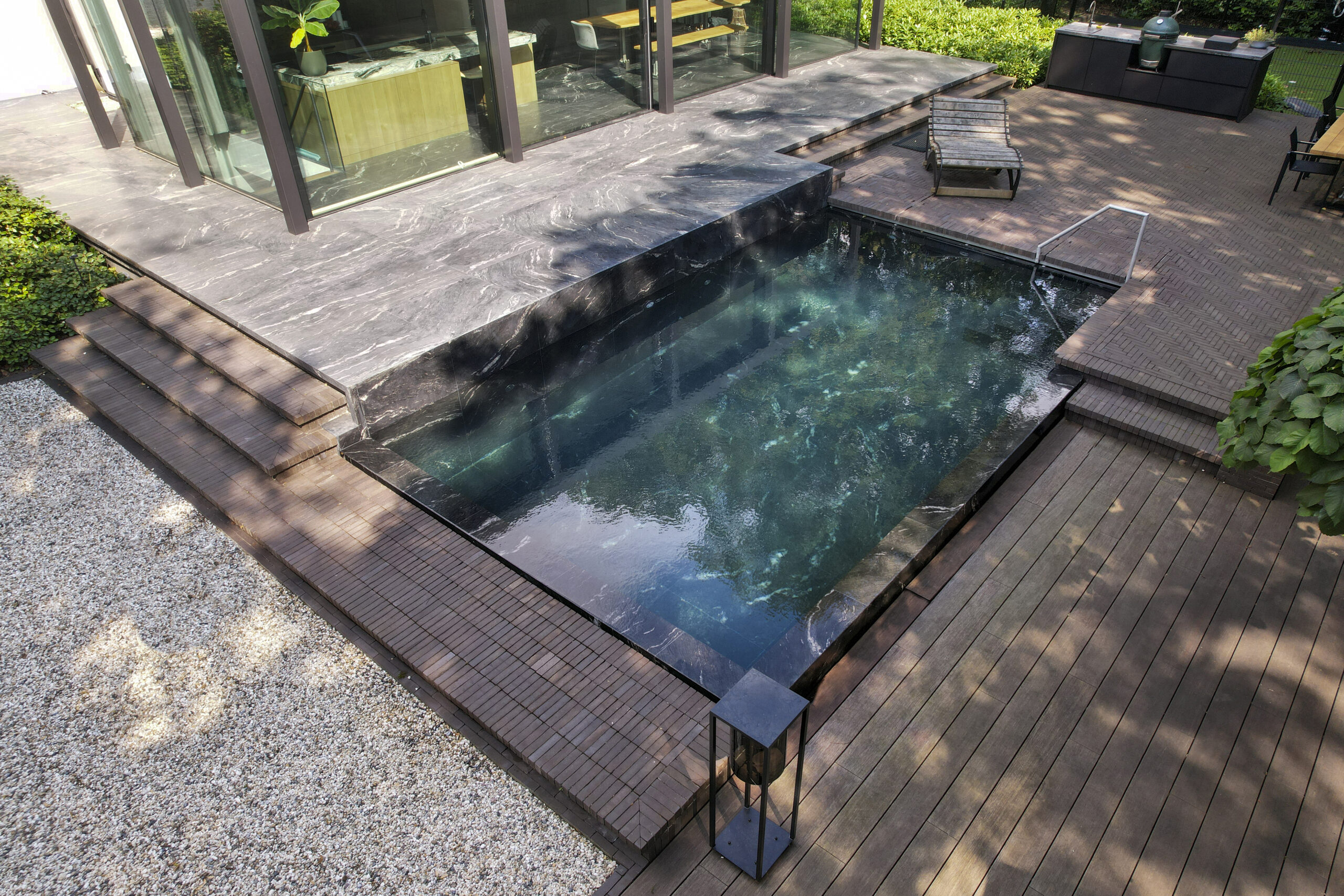 Dit project is niet voorzien van een plantenfilter. Dit is een typisch voorbeeld van een zwembad met de voordelen van een traditioneel chloorzwembad zonder de nadelen van bijtende chemie.