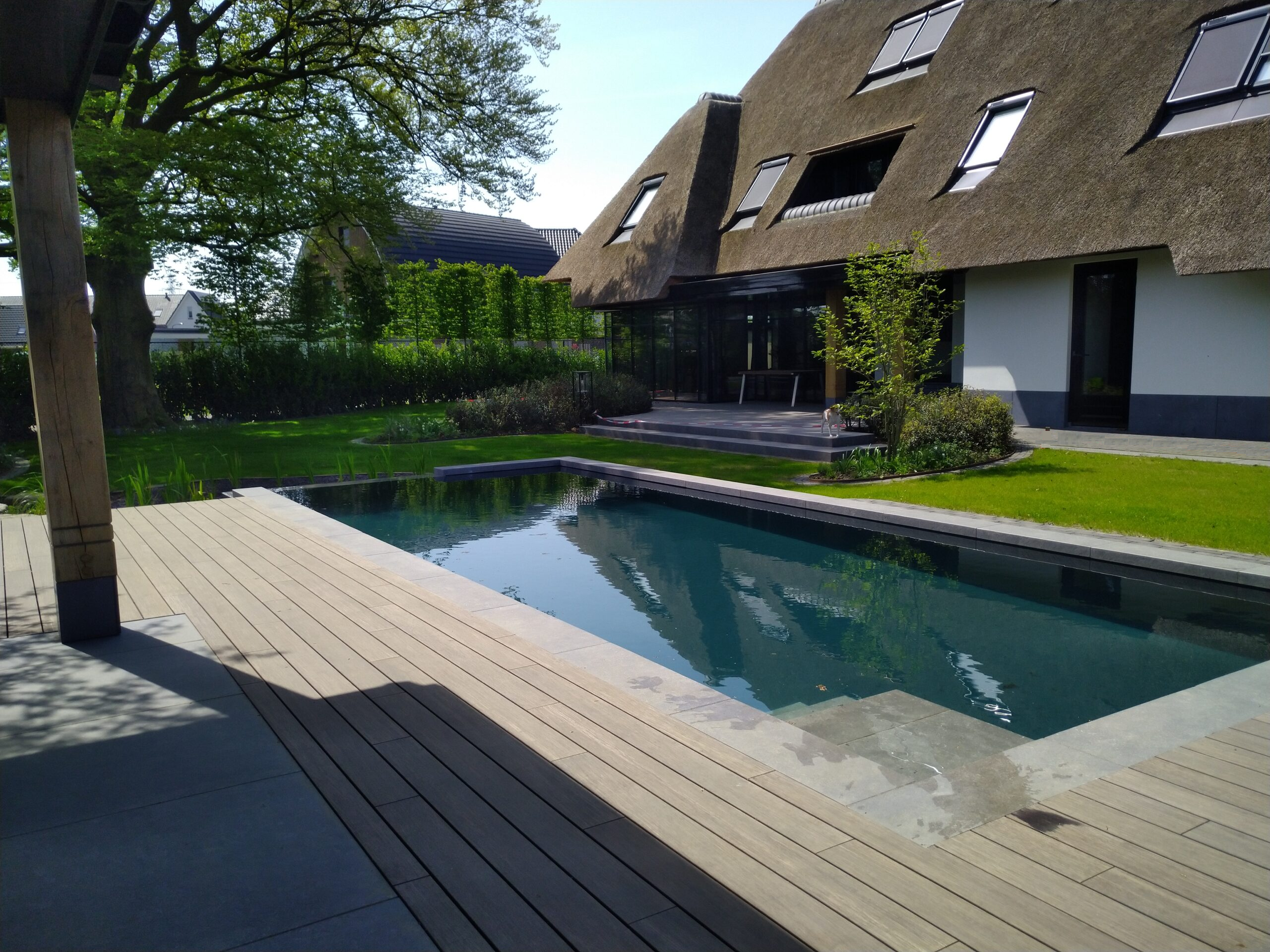 Vanuit een strakke betonnen zwembadbak loop het water in een hoek ervan vrijelijk over de rand in het ogenschijnlijk natuurlijk gevormde plantenfilter. Op de achtergrond zorgt Symbiosis Type II aanvullend voor een algenvrije bodem en wanden. Het is dat we beter weten. Ander zouden we denken dat er hier chloor aan het werk is. Echter, het water ruikt en proeft als kraanwater.