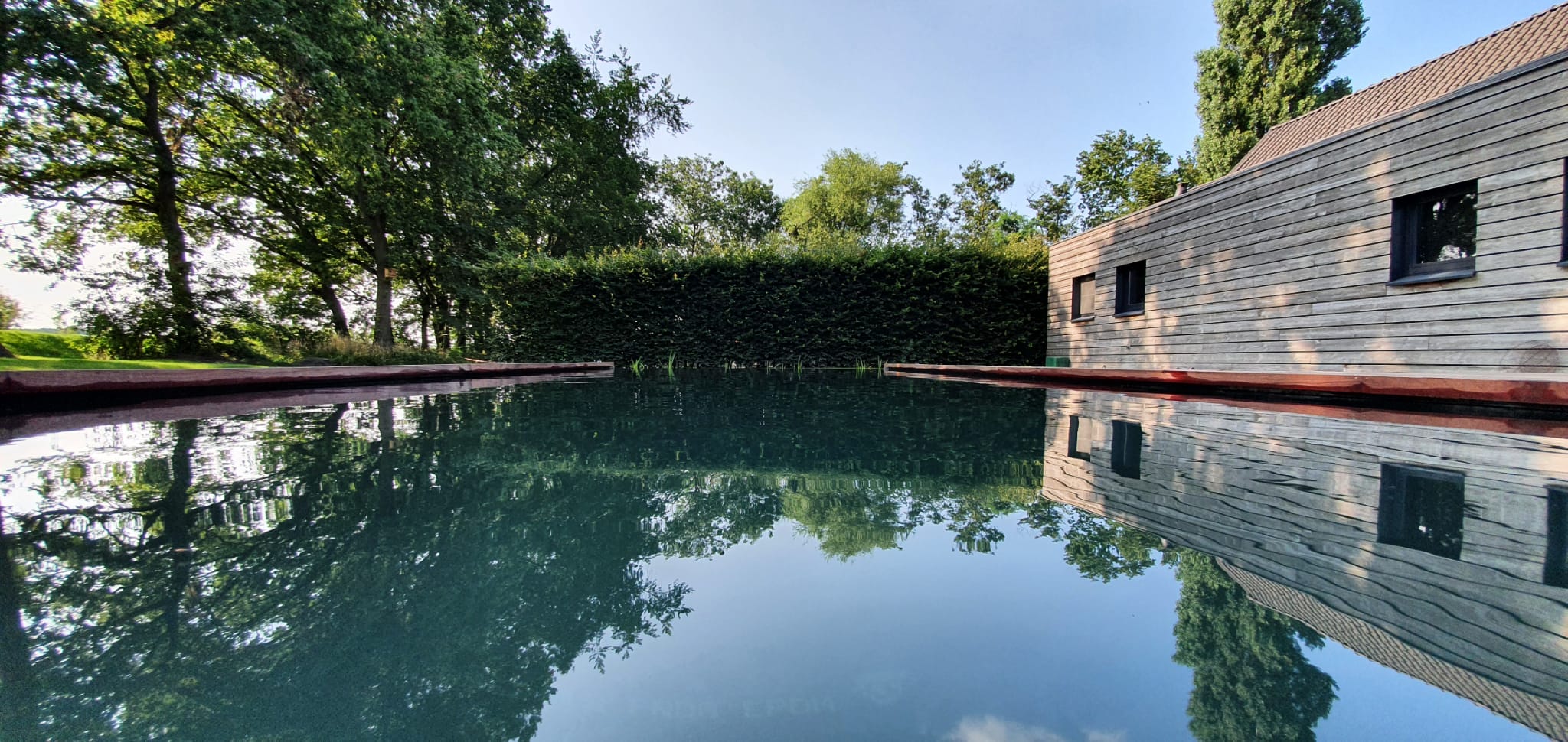 Een natuurzwembad dat past in de omgeving. Veel landbouw zorgt voor een stikstofrijke omgeving wat een oorzaak is voor veel voeding in het water. Toch lukt het ook hier om het zwembad helemaal schoon te houden.